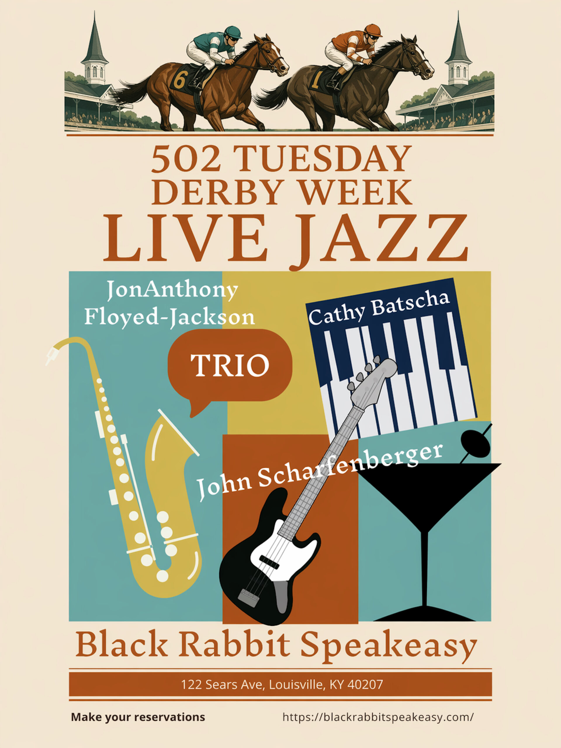 The theme of Tuesday during Derby Week at Churchill Downs is “502 Day”, and the Black Rabbit is celebrating with live jazz featuring the JonAnthony Floyed-Jackson Trio. Come over to The Black Rabbit in St Matthews after your day at the Downs and listen to the smooth sounds of the JonAnthony Trio. Reservations encouraged.