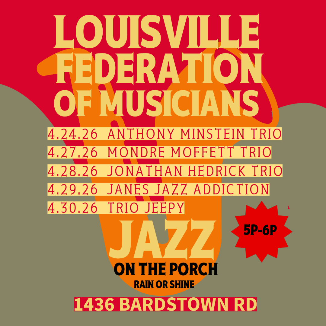 Join us for a “Happy Hour” jazz concert at the Louisville Federation of Musicians. Bring a lawn chair, snack, something to sip and enjoy some llive jazz!